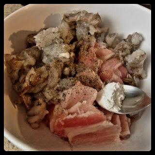 Heat 1½ tbsp oil in a pan over medium high heated, add 1tbsp mince garlic, sauté foe a few minute or until the garlic turn brown. Add marinated pork belly and shrimp, cook for 3 to 5 minutes. Because I have some left over scallion so I sauté with garlic, but you can leave that out.